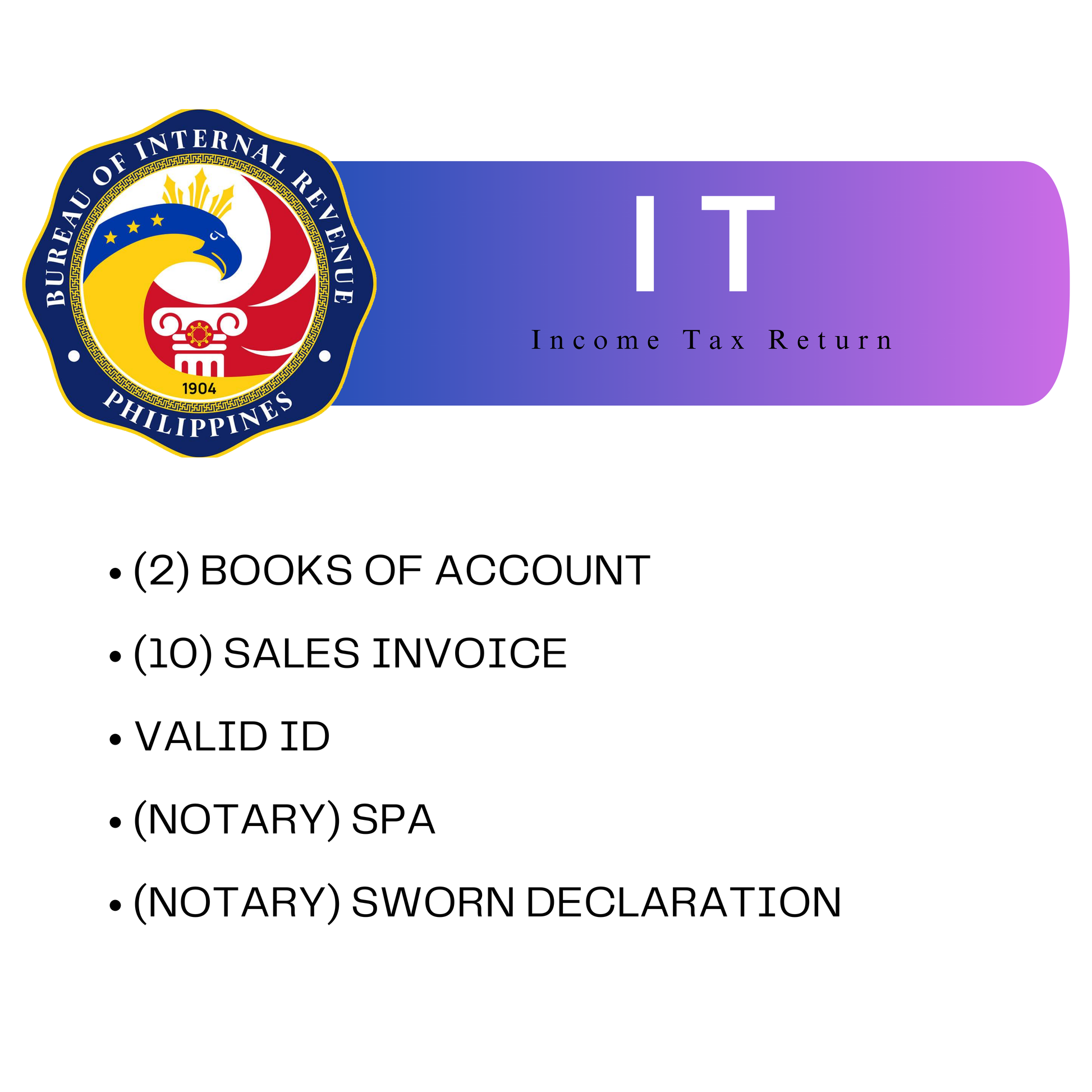 We provide fast and reliable assistance in filing your Income Tax Return with the BIR. Our service ensures that all requirements are complete—Books of Accounts, Sales Invoices, Valid IDs, and Notarized Documents—helping you avoid penalties and stay compliant with tax regulations.